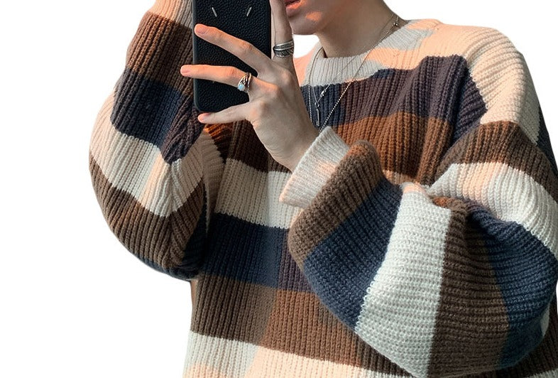 Thick Striped Sweater Men's Loose Round Neck Sweater