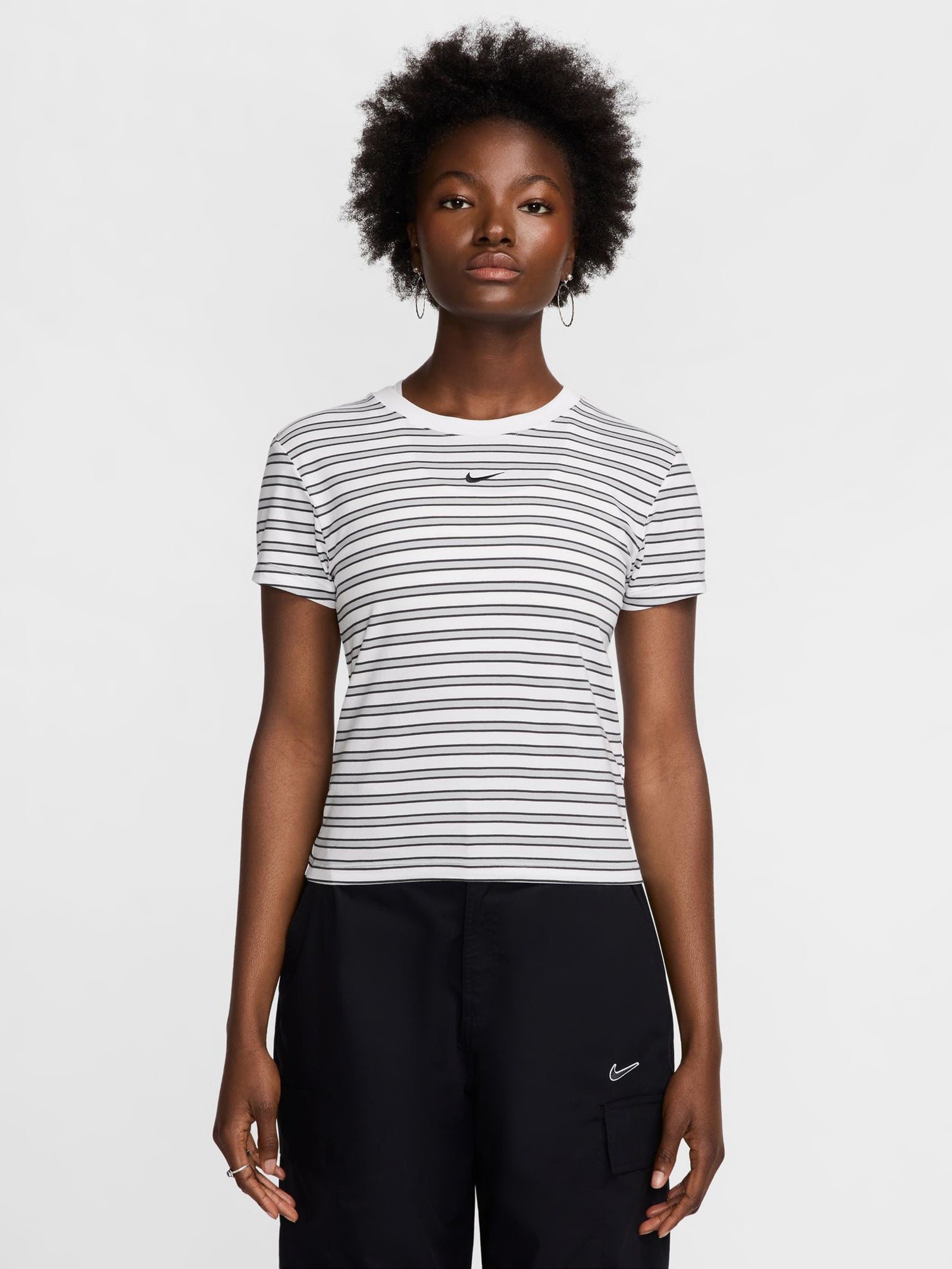Elevate your everyday essentials with the nittgke Sportswear Chill Knit Tee. Designed with a slightly cropped and fitted silhouette, this striped tee offers a modern, sporty edge. The embroidered Swoosh logo at the center chest adds a signature touch, making it a versatile staple for any wardrobe.