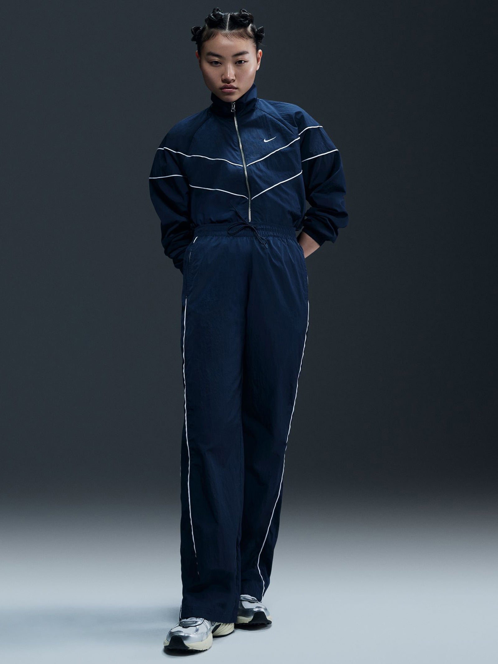 Designed for both style and function, the Women's High-Waisted Woven Open-Hem Pants from nittgke, offer a versatile and breathable fit. Fully lined with 100% polyester mesh, these off-white pants provide all-day comfort while maintaining a lightweight feel. The embroidered Swoosh logo adds a signature touch, and built-in UVA and UVB protection enhances coverage where the fabric meets the skin. Perfect for effortless, sporty styling.